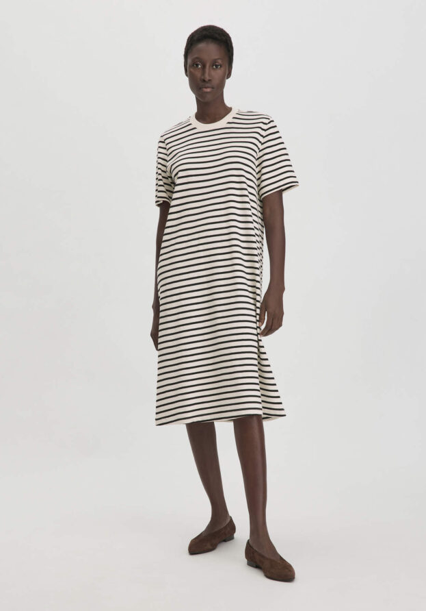 Bon Voyage – Das gestreifte, classy Kleid aus softer, nachhaltiger Bio-Baumwolle in hochwertigem Jersey, bringt nicht nur Freude en vacance, sondern trägt Ferienleichtigkeit auch in den Alltag.